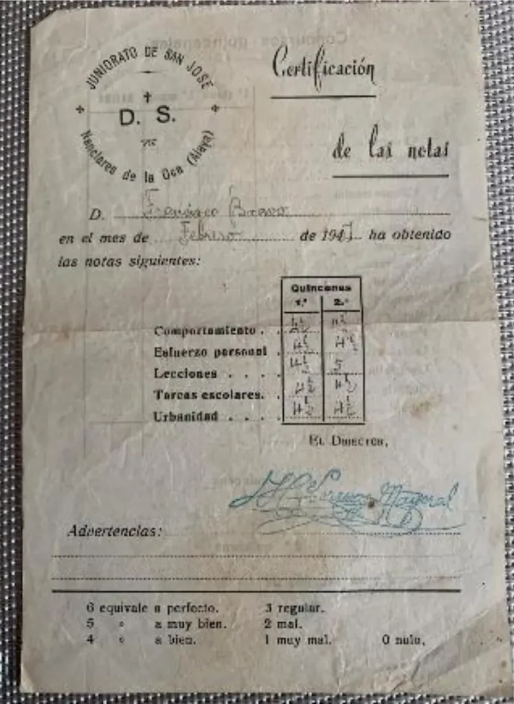 En Nanclares no solo se evaluaba el saber sino otros aspectos de la vida cotidiana, como atestiguan sus calificaciones del año 1951. La actitud en la oración -se miraba para la nota semanal de comportamiento- ahí, Paco, ni movía los ojos: siempre a lo suyo y con la vista en el crucifijo. Rezaba de manera aplicada y con intención: ¿sentía la voz del Señor? Él nunca soltó prenda: “¡Eso son cosas mías!, ¡deja!”, nos dice el mismo compañero de camino.