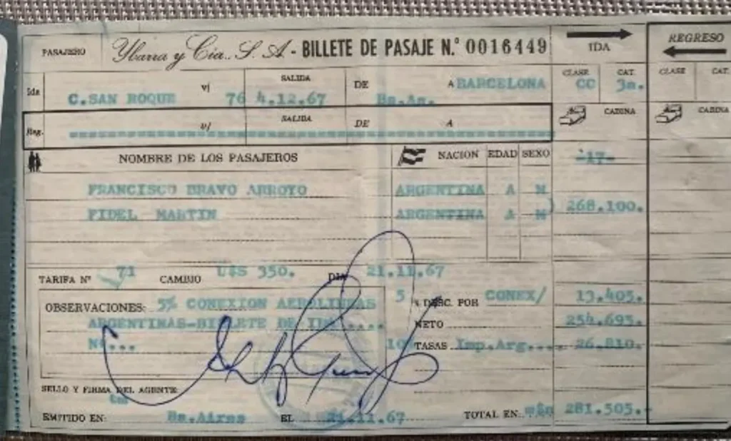 En diciembre del año 67 regresó a España, por primera vez, y lo hizo con el Hno Fidel Martín. El viaje duró casi un mes, atestigua su hermano Teo y aporta una reliquia, el pasaje.